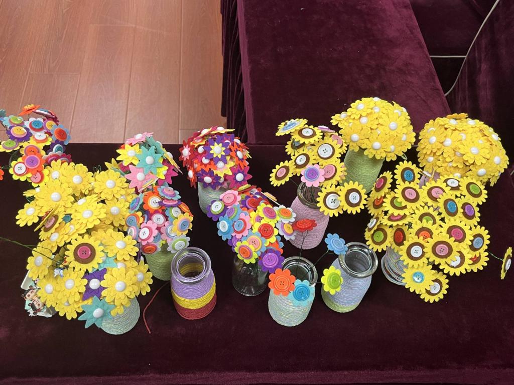 女生们满怀期待围坐桌旁,目光热切地落在摆满的材料上:五颜六色的纽扣、纤细的铁丝、精致的花蕊以及各类制作工具。同学们仔细研读说明书、交流探讨后,迅速掌握制作诀窍,纷纷动手实践。纤细的手指穿梭于纽扣与铁丝之间,将创意与巧思融入每一片花瓣、每一束花蕊。不一会儿,一支支形态各异、娇艳欲滴的纽扣花在她们手中绽放,或雍容华贵,或清新淡雅,宛如春日里争奇斗艳的繁花。
