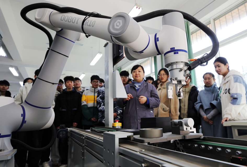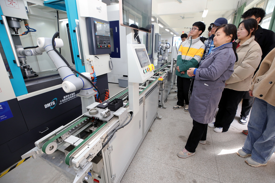 ▲3月8日,西安科技大学解晖老师和智能制造2023级学生在智能制造实验室做工业机器人在数控加工中的应用实验。