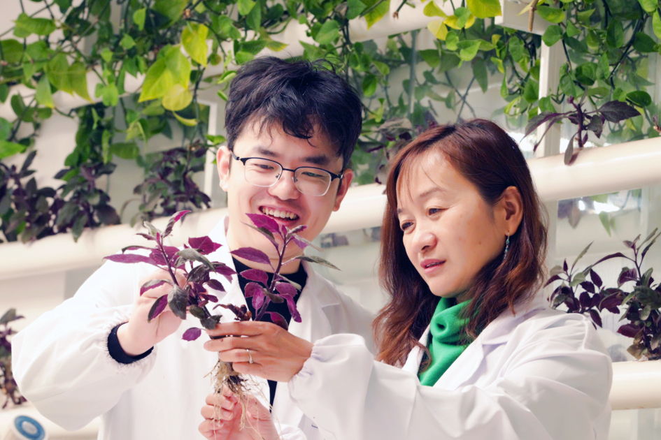 ▲3月8日,毕银丽教授在植物实验室指导研究生观察微生物修复对植物叶片发育特征。