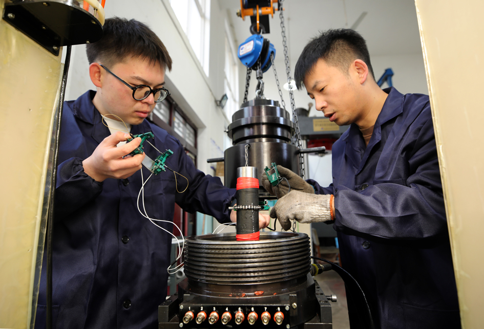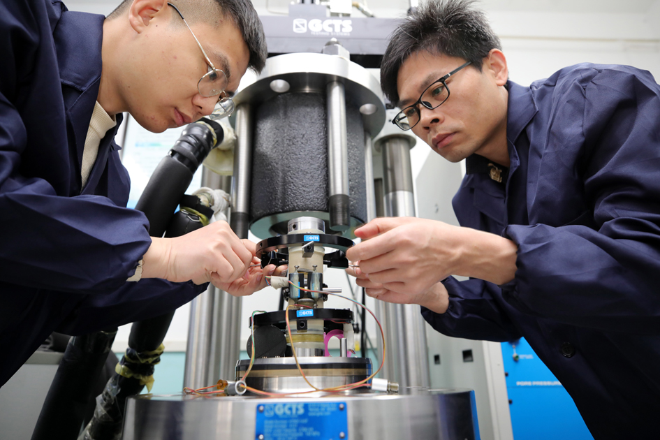 ▲3月8日上午,西安科技大学建筑与土木工程学院的科研人员在深部岩土动静三轴力学特性实验室做裂隙花岗岩三轴压缩试验。