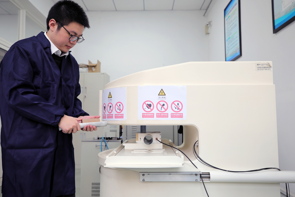 ▲3月8日上午,西安科技大学建筑与土木工程学院的肖康勇在做岩土核磁共振测试分析实验室做低温砂岩未冻结水含量测试实验。