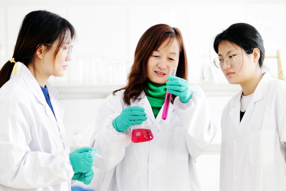 ▲3月8日,毕银丽教授在生物实验室指导研究生做微生物侵染指标的染色剂配置。