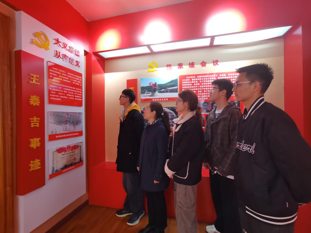 随后,尖角村党支部书记带领师生依次参观王泰吉革命事迹馆、北田村村史馆和党性体验中心。通过聆听讲解、观看视频,现场感悟王泰吉烈士为革命奋斗的一生,缅怀革命先烈坚守初心、献身革命的大无畏精神,激发同学们踔厉奋发、真抓实干的创新热情。