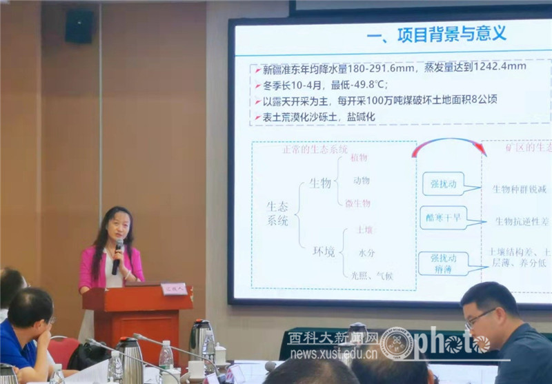 毕银丽代表项目组做总体研究工作汇报,各课题负责人就项目包含的干旱区露天采煤区生态效应监测、开采工艺优化及生态损伤控制技术、水资源分布格局与利用技术、沙尘控制与土壤修复技术、生态重构技术、生态修复示范区建设等进行了专题进展汇报。专家组进行各课题的评估与讨论,一致认为西安科技大学承担的干旱生态脆弱区煤炭基地生态修复与保护项目按照合同任务书要求,按期完成了中期研究内容,提交的中期研究报告完整、规范、数据翔实,达到了预期目标。专家组一致同意通过中期评估。
