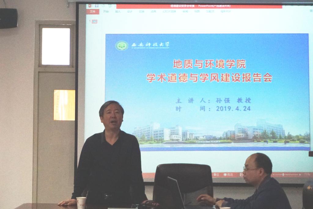 4月24日,地质与环境学院在雁塔校区煤科大楼613报告厅举办研究生“科学道德与学风建设报告会”,博士生导师、孙强教授作了题为《学术生涯规划与学术道德建设》的专题报告。报告会由学院副院长唐胜利教授主持,研究生培养办公室主任高欣老师、辅导员韩蕊老师以及博、硕士研究生参加。