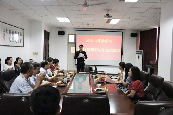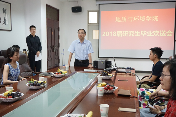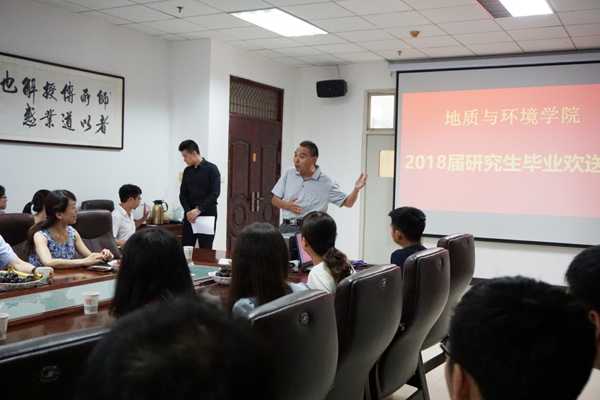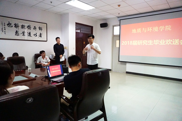6月29日下午,地质与环境学院在雁塔校区行政楼613举办了2018届研究生毕业欢送会。学院党政领导、教师代表及2018届全体研究生参加了欢送会。毕业生代表地质工程硕士陈达、在职工程李小雪代表同学回顾了三年的学校生活并对学校及老师的培养表达了感谢;薛喜成教授代表教师祝贺同学们顺利毕业并提出了殷切希望;院长王生全为毕业生送上祝福:“愿大家顺利启航,不断学习,严谨工作,享受生活,也希望大家变成更好的自己。”随后,学院颁发了优秀毕业生及优秀硕士学位论文,并为所有毕业生颁发了刻有学生姓名和学院院徽的石质印章。最后,大家一起观看了学院精心制作的毕业纪念视频。三年的欢笑与泪水的交织,幸福与回忆的交错,浓浓的情谊弥漫在了整个会议室内。