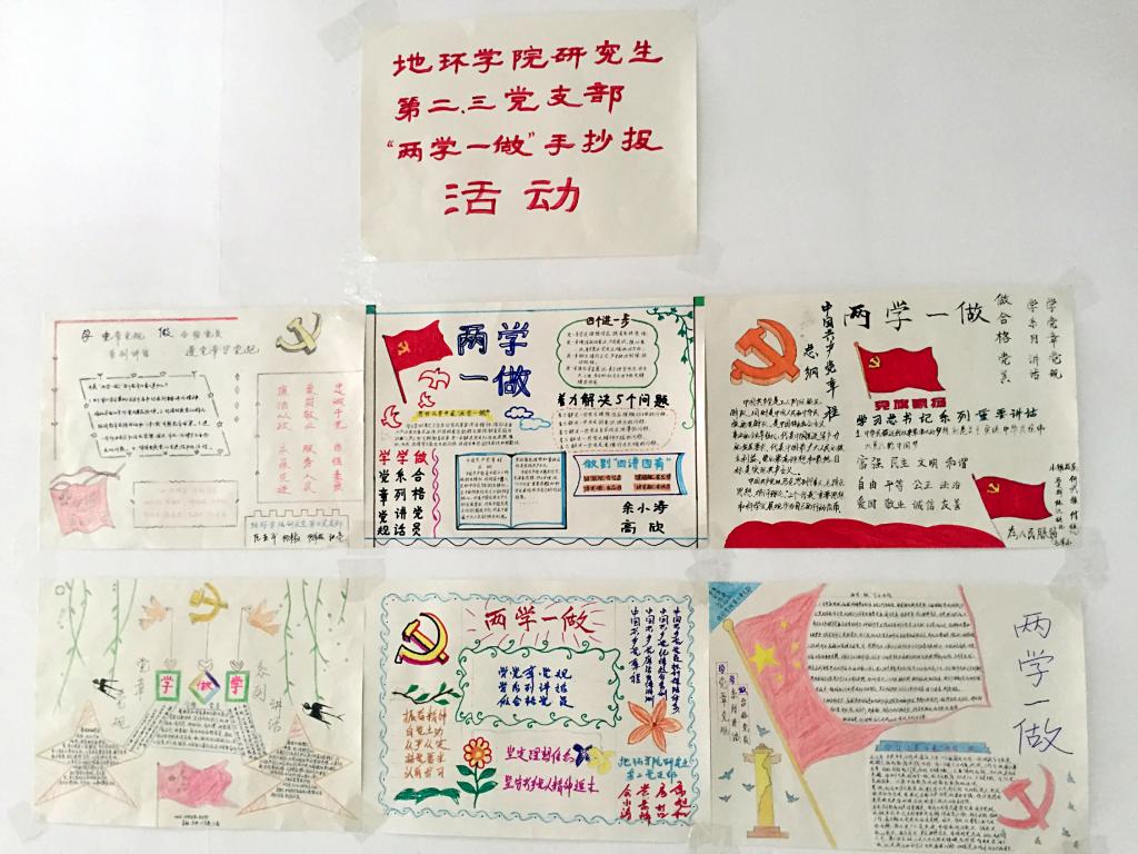 近日,为丰富“两学一做”学习教育形式,地环学院研究生第二、第三党支部成员开展了“两学一做”手抄报活动。两个支部全体党员都精心设计、合理布局,充分展示了“两学一做”学习教育内容,手抄报在雁塔校区行政楼六楼展出后,广受师生好评。开展此次手抄报活动,不仅展示了地环学院研究生党员的才华,而且丰富了“两学一做”学习教育形式,提高了全体党员开展学习教育的积极性。
