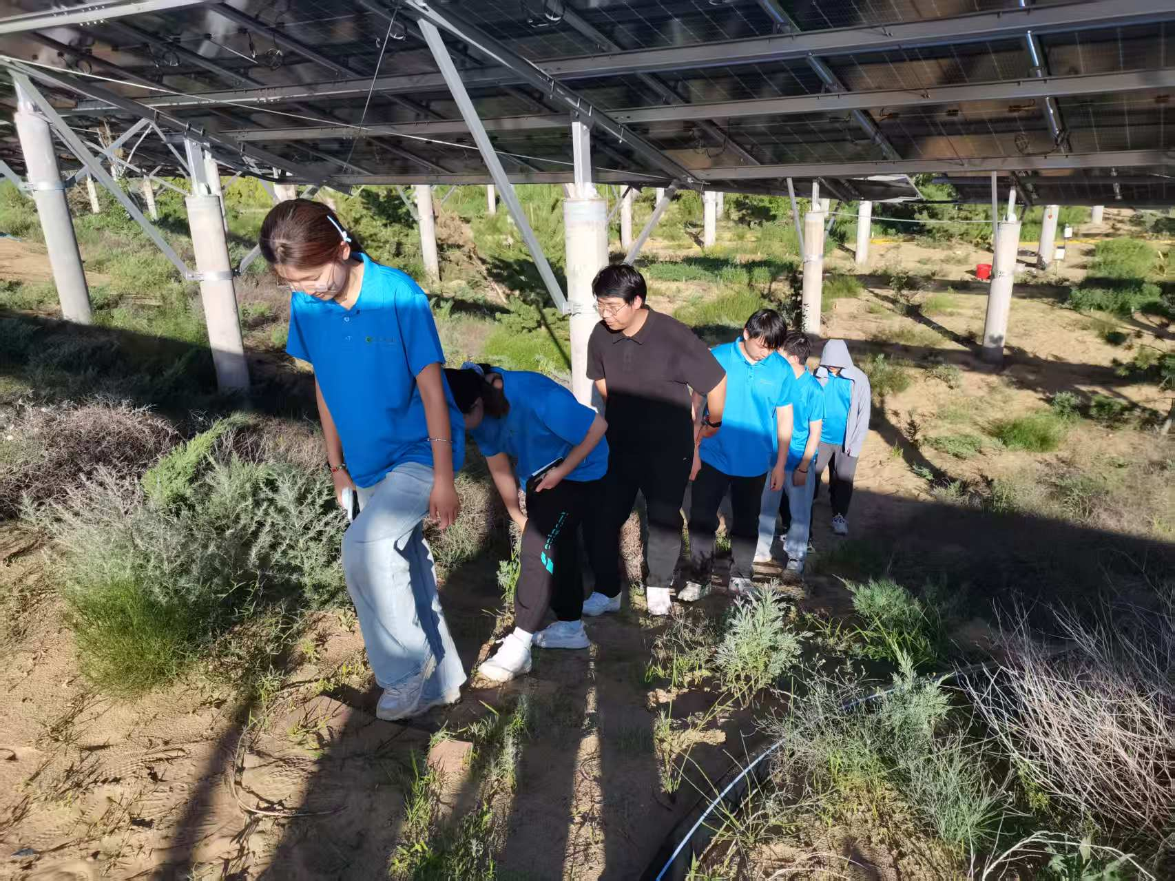 在光伏发电设备现场,项目成员白祖诚向实践团成员介绍光伏固沙的优势、光伏板条件下雨水的分布规律及对植物生长的多方位调控,光伏板的建设有助于减弱风力,减少扬沙浮沉,形成物理固沙。土壤在这里呈现出板上下缘和中部缝隙含水量高,对应植物生长茂盛。